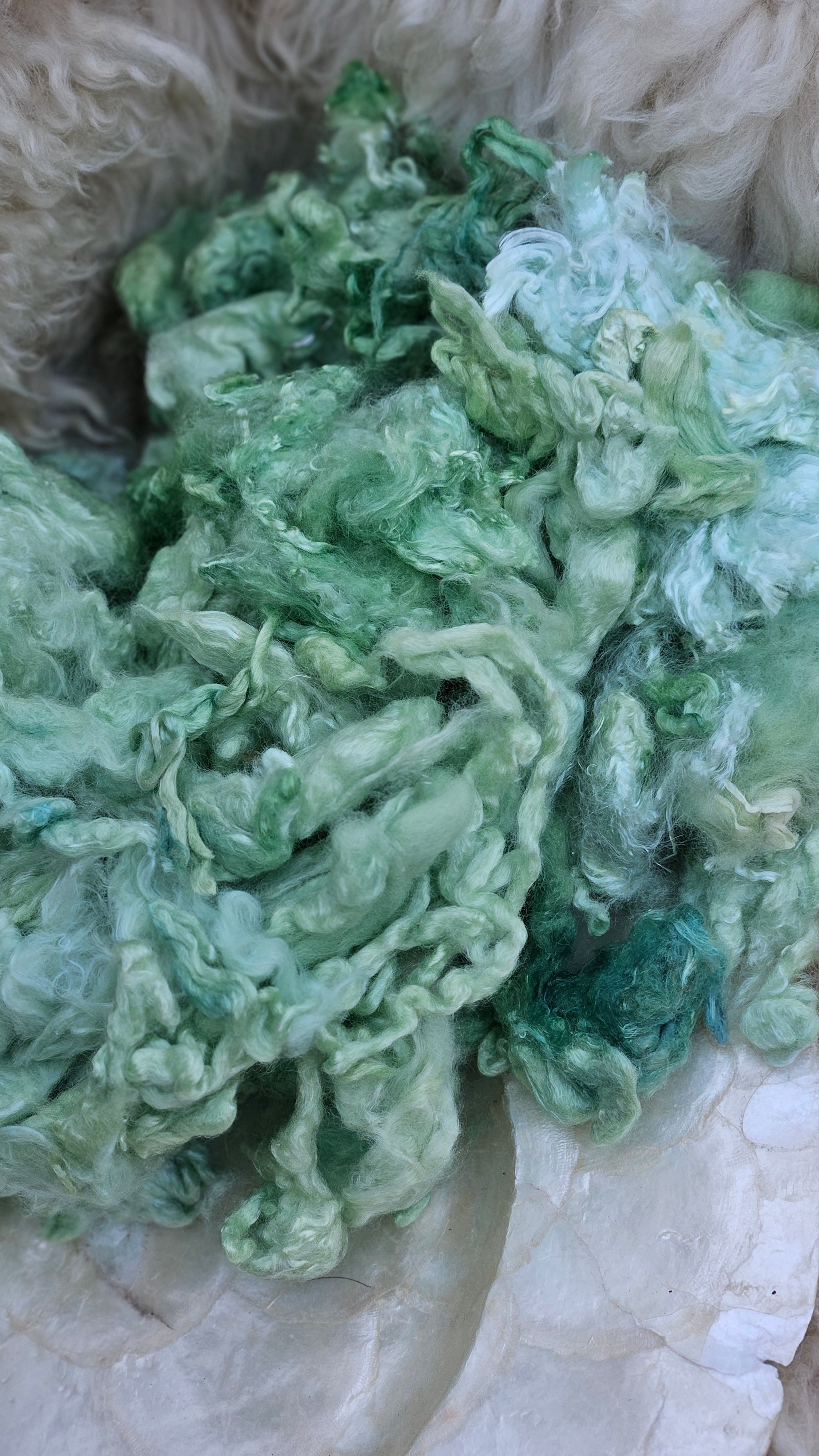 These dense mallowy chunks can be hand-picked very easily to create a fluffy cloud. Running it thru a wool picker would create divine fluffy cloud. This zero-waste fiber is a perfect foundation for art batts, felting, and fiber art.