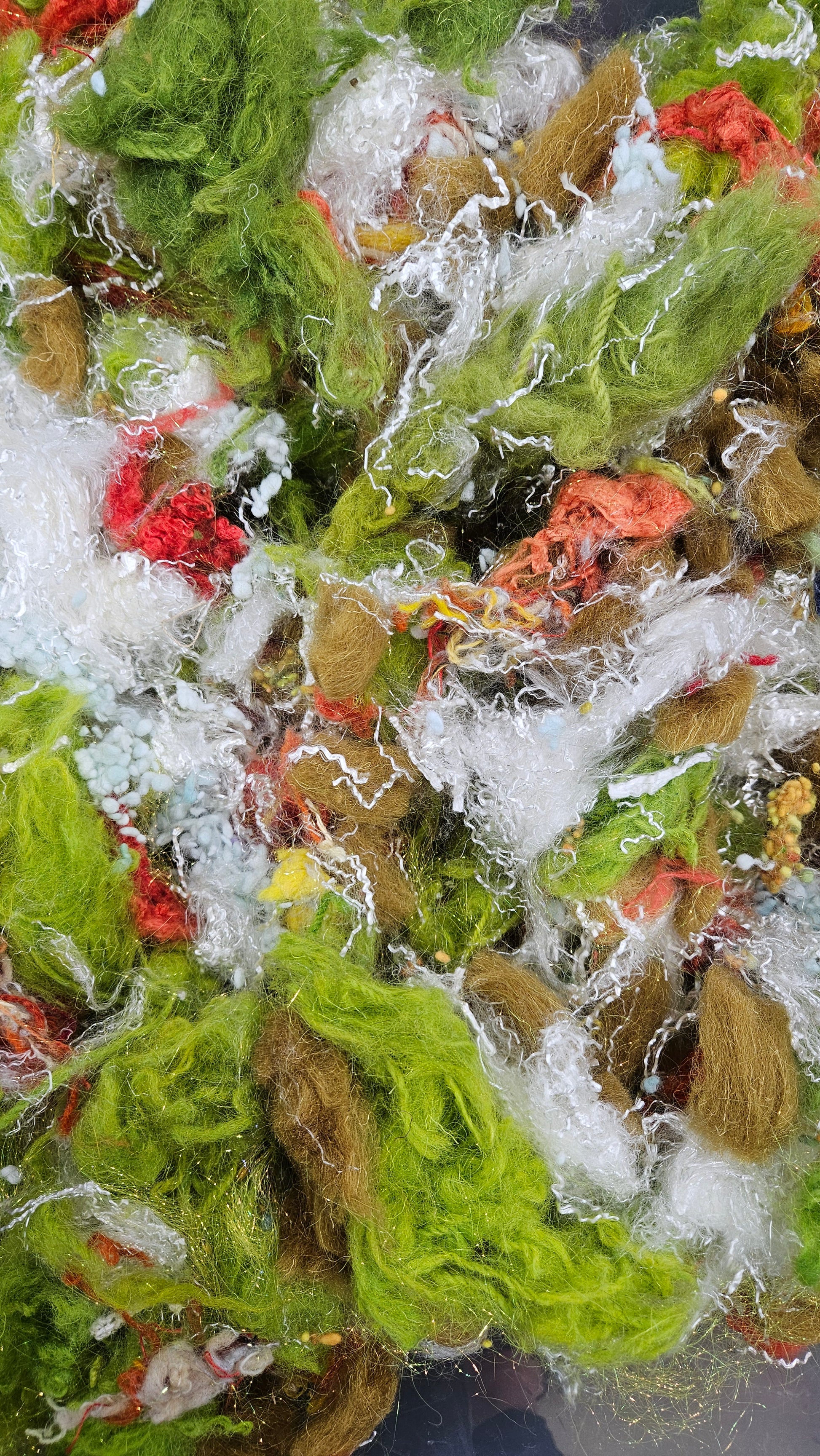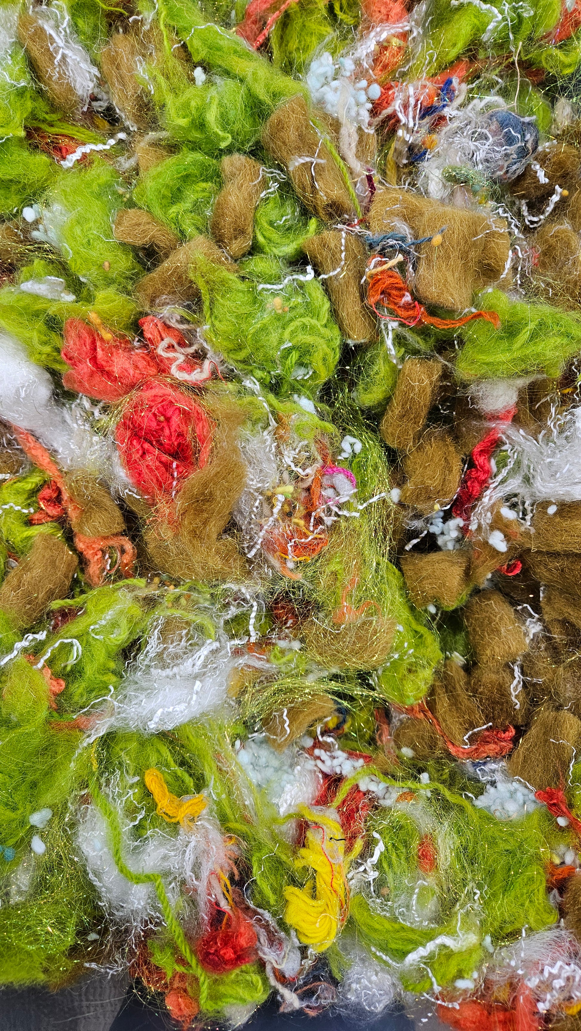 An extra chunky blend of cardable fibers for creating art batts, rolags, or other blends to spin into yarn for knitting, weaving, and crochet. One pinch goes a long way!